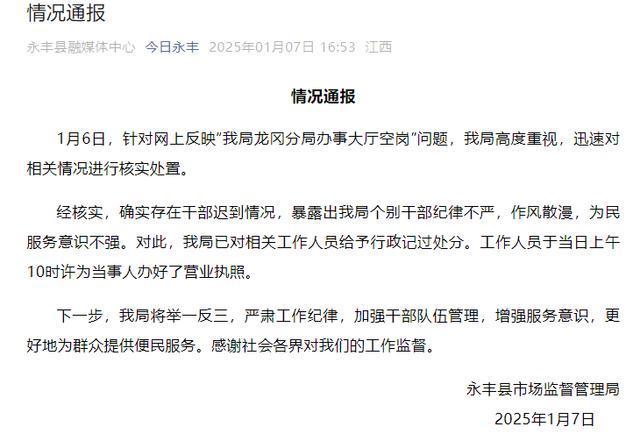 1月7日,江西省吉安市永丰县市场监督管理局发布情况通报:1月6日,针对网上反映“我局龙冈分局办事大厅空岗”问题,我局高度重视,迅速对相关情况进行核实处置。